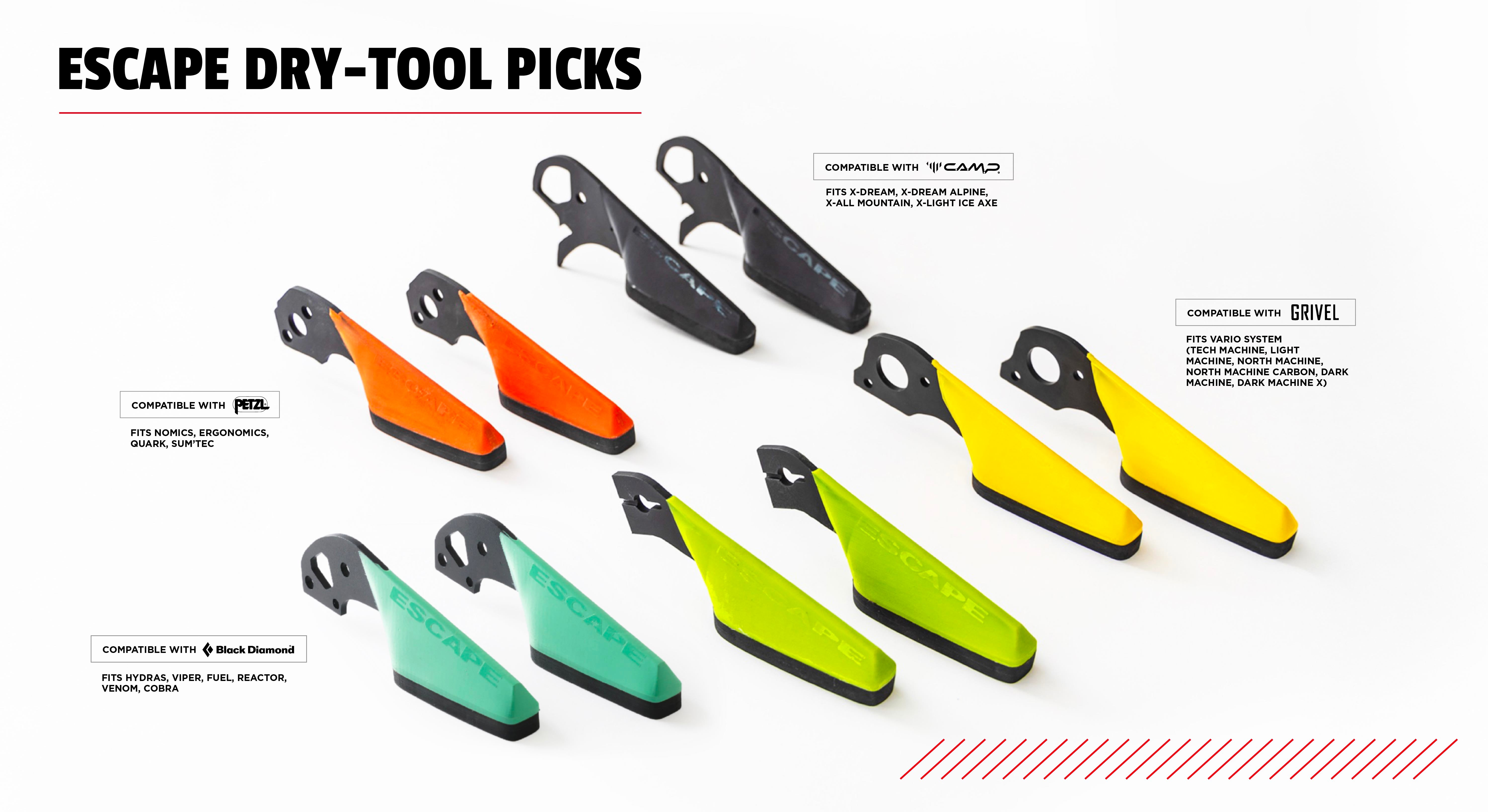 The first hold friendly picks that are specifically designed for your technical ice tools. Manufactured with a Stealth Rubber base to keep the highest friction and control while dry tooling. They install just like a replacement pick. Steel spine, plastic body, and a stealth rubber bottom for grip. Please use caution as dry tooling is a dangerous activity. Sold in sets of 2 picks. Making picks is a time consuming process and are made to order. The Grivel picks are compatible with the Vario System. The Cassin/Camp picks are compatible with the X-Dream System.