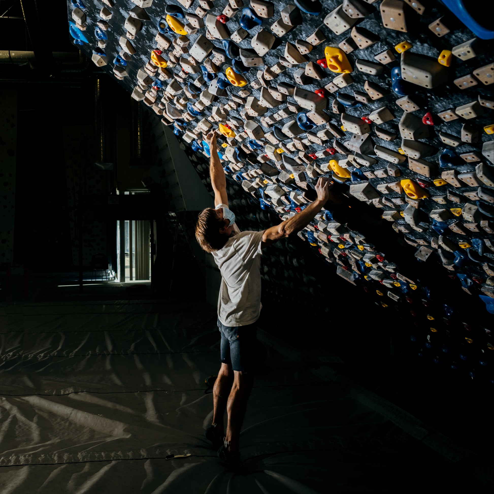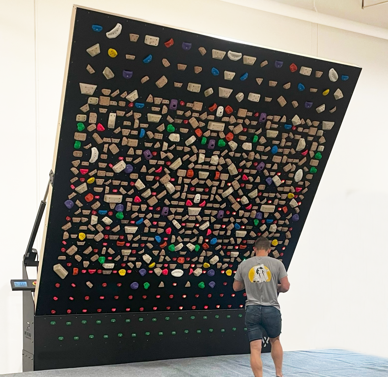 Holds and Layout are paramount in the design of the woods Board. The majority of the design went into the crafting of a set of holds that were extremely ergonomic, useful, and interesting. The plastic holds are all dual-text,. Also the texture has been made to be so fine that it is indistinguishable from the wood hold texture. All the feet on the wall can comfortably rather than begrudgingly utilized as hands. The layout while of the utmost importance only took 3 days to get the board to 95% complete. This was because of Andy's 23 years of experience of spray wall and training wall setting experience. with this experience 100% of the wall layout is purpose built to ensure maximum fun, creativity, and training ability for the user. Currently even prior to full availability there are over 300 problems from V0-V14 already on the board with the app supporting 20-70 degree angles.